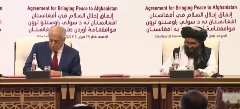 قطر کے دارالحکومت دوحہ میں ہونے والی تقریب میں افغان طالبان کی جانب سے ملا عبدالغنی برادر اور امریکاکی جانب سے نمائندہ خصوصی برائے افغان مفاہمتی عمل زلمے خلیل زاد نے دستخط کیے۔