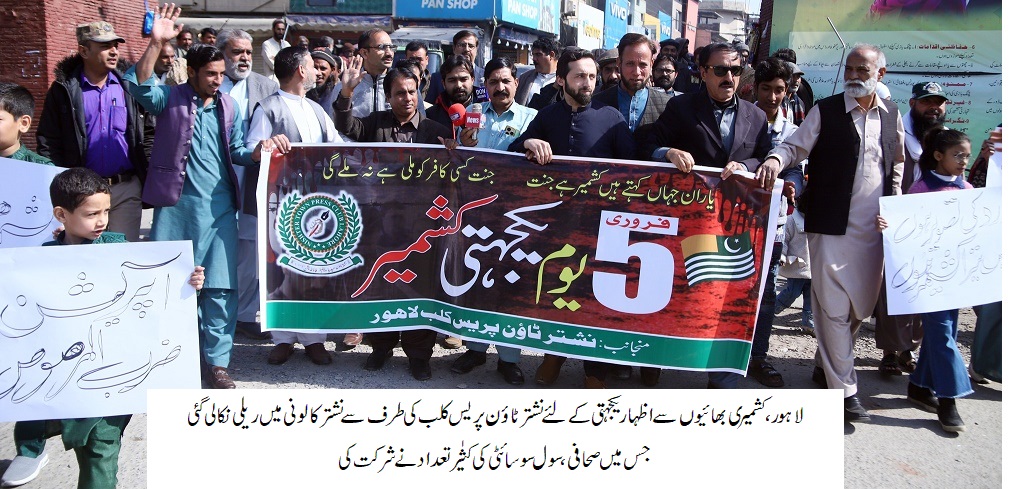 لاہور ؛ (ایم اے تبسم سے)ملک بھر کی طرح نشترٹاؤن پریس کلب لاہور میں یوم یکجہتی کشمیر کے موقع پرکشمیری عوام سے اظہاریکجہتی کے لئے ایک شاندار ریلی کا انعقادکیا گیا،یہ ریلی چیف ایگزیکٹونشترٹاؤن پریس کلب الہور سینئرصحافی وکالم نگار فیاض احمدرانا کی خصوصی ہدائیت پرنکالی گئی،جس میں صحافیوں،سول سوسائٹی،تاجروں اور ہرمکتبہ فکرکے لوگوں نے بڑھ چڑھ کرحصہ لیا.