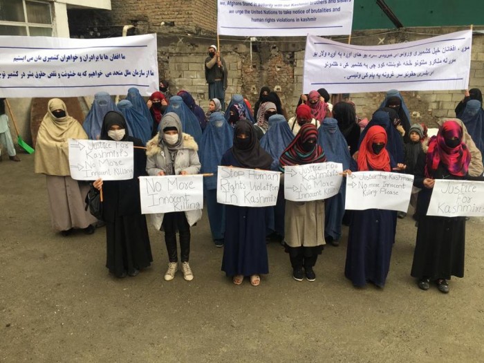 کابل: بھارتی مظالم کا شکار مقبوضہ کشمیر کے کشمیریوں کے حق میں کابل میں خواتین نے مظاہرہ کیا . دارالامان کے علاقے میں ہونے والے مظاہرے میں شریک خواتین مظاہرین کی جانب سے بھارتی مظالم کے خلاف نعرے بازی کی گئی . خواتین نے بینرز بھی اٹھارکھے تھے جن پر کشمیریوں کی حمایت میں مطالبات درج تھے . کشمیریوں سے اظہار یکجہتی کیلئے کابل میں ہونے والا یہ پہلا مظاہرہ ہے.